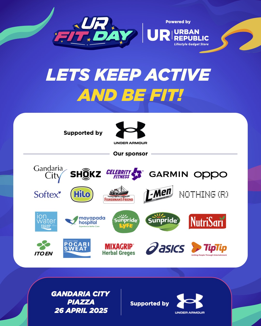 More than 20 well-known brands took part in supporting UR FIT DAY, including Gandaria City, Under Armour, Shokz, Celebrity Fitness, Garmin, Oppo, Softex, Hilo, Fisherman’s Friend, L-men, Nothing, Ion Water, Mayapada Hospital, Sunpride Lyfe, Sunpride, Nutrisari, Ito-en, Mixagrip, Asics, Tiptip.